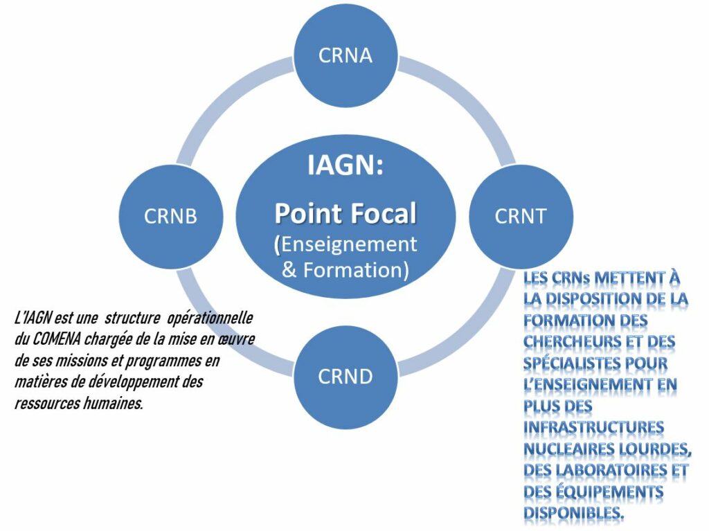 Collaboration L’institut est soutenu et supporté par les quatre centres de recherche nucléaire (CRNs) du Commissariat à l’Energie Atomique (COMENA). CRNA : Centre de Recherche Nucléaire d’Alger. CRNB : Centre de recherche Nucléaire de Birine. CRND : Centre de Recherche Nucléaire de Draria. CRNT : Centre de Recherche Nucléaire de Tamenghasset.